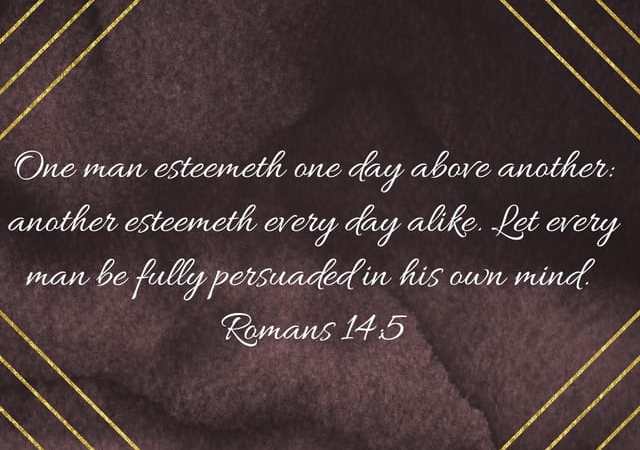 One man esteemeth one day above another: another esteemeth every day alike. Let every man be fully persuaded in his own mind. He that regardeth the day, regardeth it unto the Lord; and he that regardeth not the day, to the Lord he doth not regard it. He that eateth, eateth to the Lord, for he giveth God thanks; and he that eateth not, to the Lord he eateth not, and giveth God thanks. Romans 14:5-6