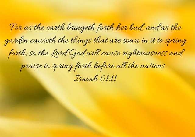 For as the earth bringeth forth her bud, and as the garden causeth the things that are sown in it to spring forth; so the Lord GOD will cause righteousness and praise to spring forth before all the nations. Isaiah 61:11
