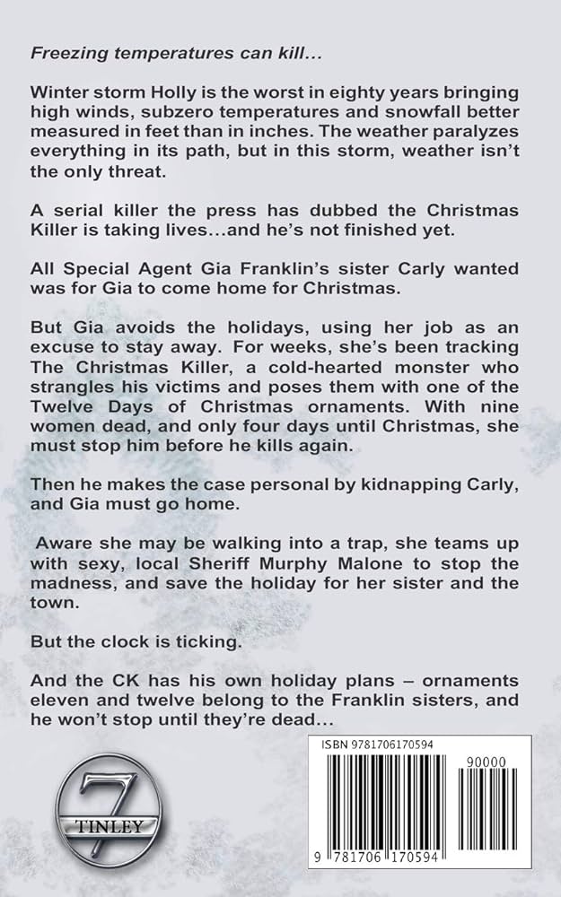 But Gia avoids the holidays, using her job as an excuse to stay away. For weeks, she’s been tracking The Christmas Killer, a cold-hearted monster who strangles his victims and poses them with one of the Twelve Days of Christmas ornaments. With nine women dead, and only four days until Christmas, she must stop him before he kills again.